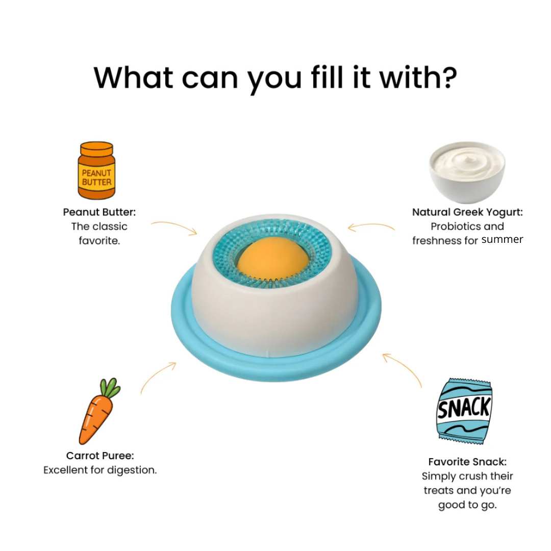 Îl poți folosi cu alimente care pot fi linse sau care ajută la mâncat mai încet, precum mâncare umedă, pate, iaurt natural fără zahăr, mâncare tocată sau gustări moi potrivite pentru câini. Este de asemenea ideal pentru diete speciale sau pentru a amesteca suplimente într-un mod mai controlat.